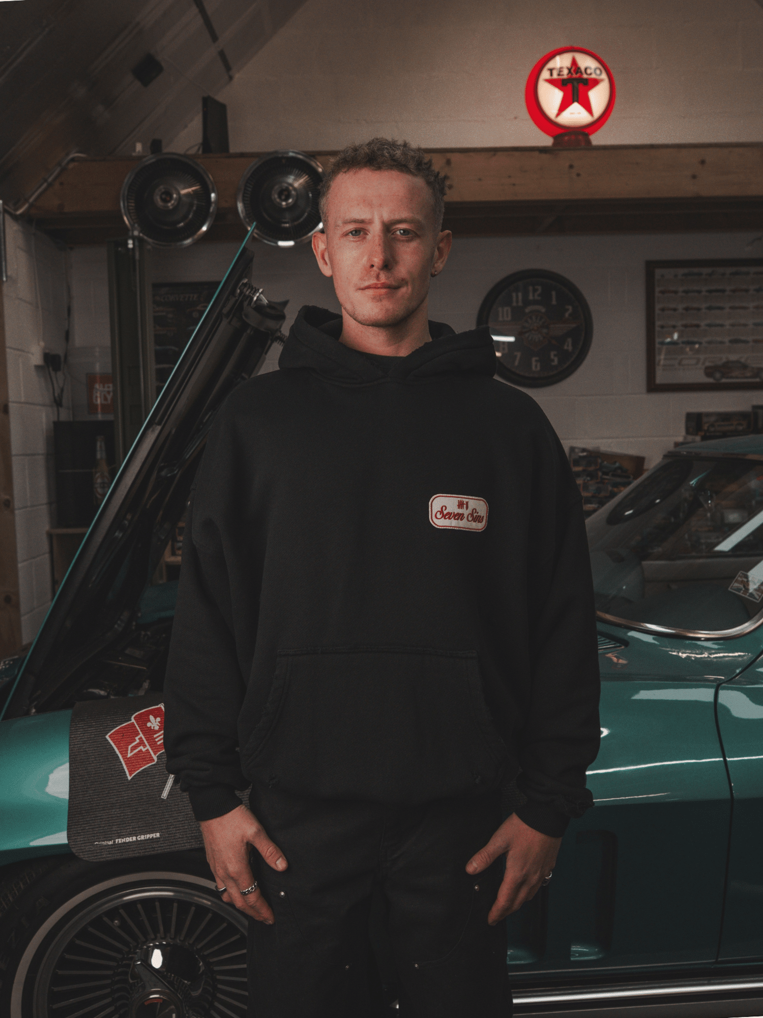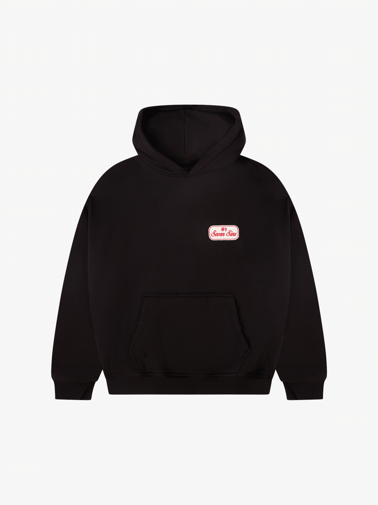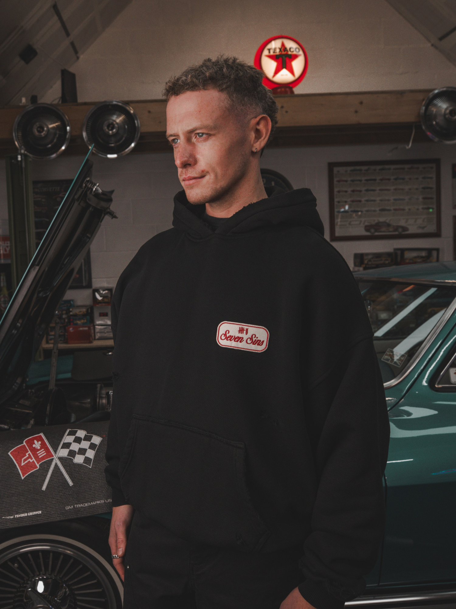 Introducing the Workwear Hoodie in Black. This Hoodie is crafted from premium 490gsm heavyweight cotton, offering a substantial, premium feel. Its cropped, boxy silhouette with slightly dropped shoulders provides a relaxed fit. Each piece is individually hand-finished. Featuring custom Seven Sins patch to the chest. Finished with slight distressing to the hood and the cuffs.